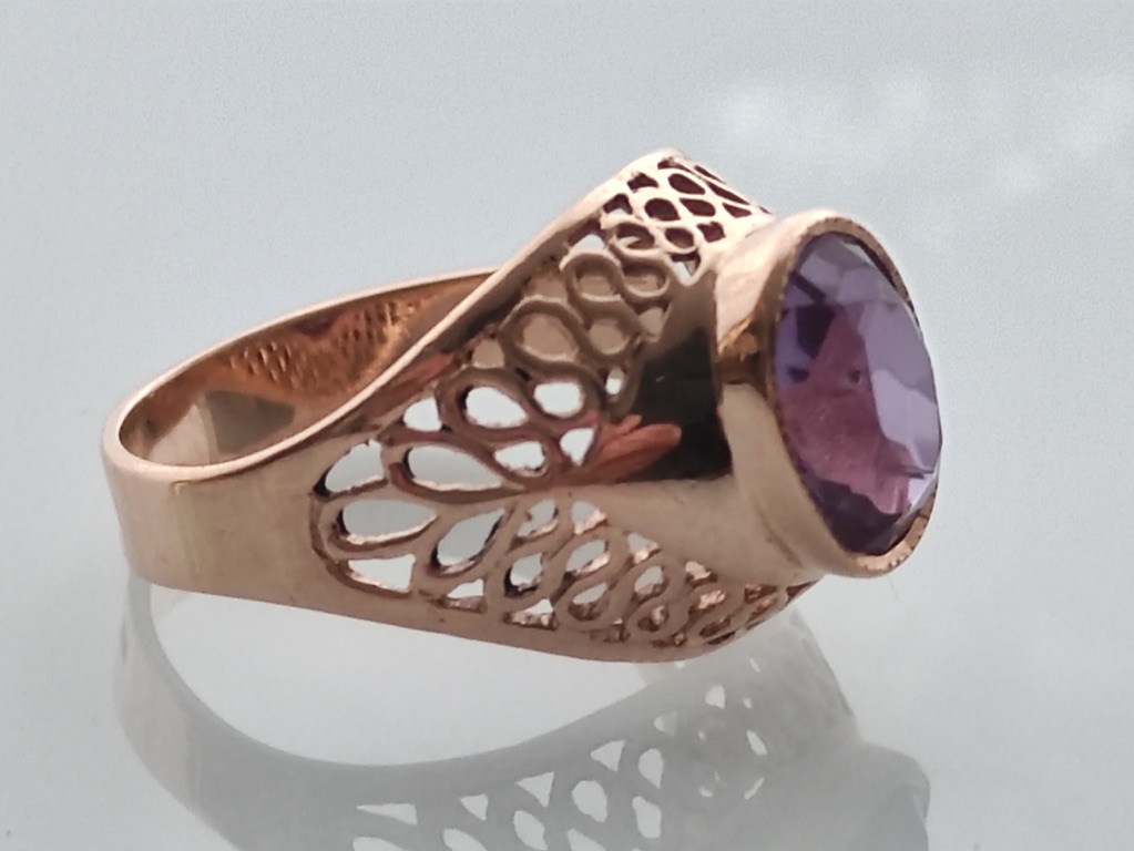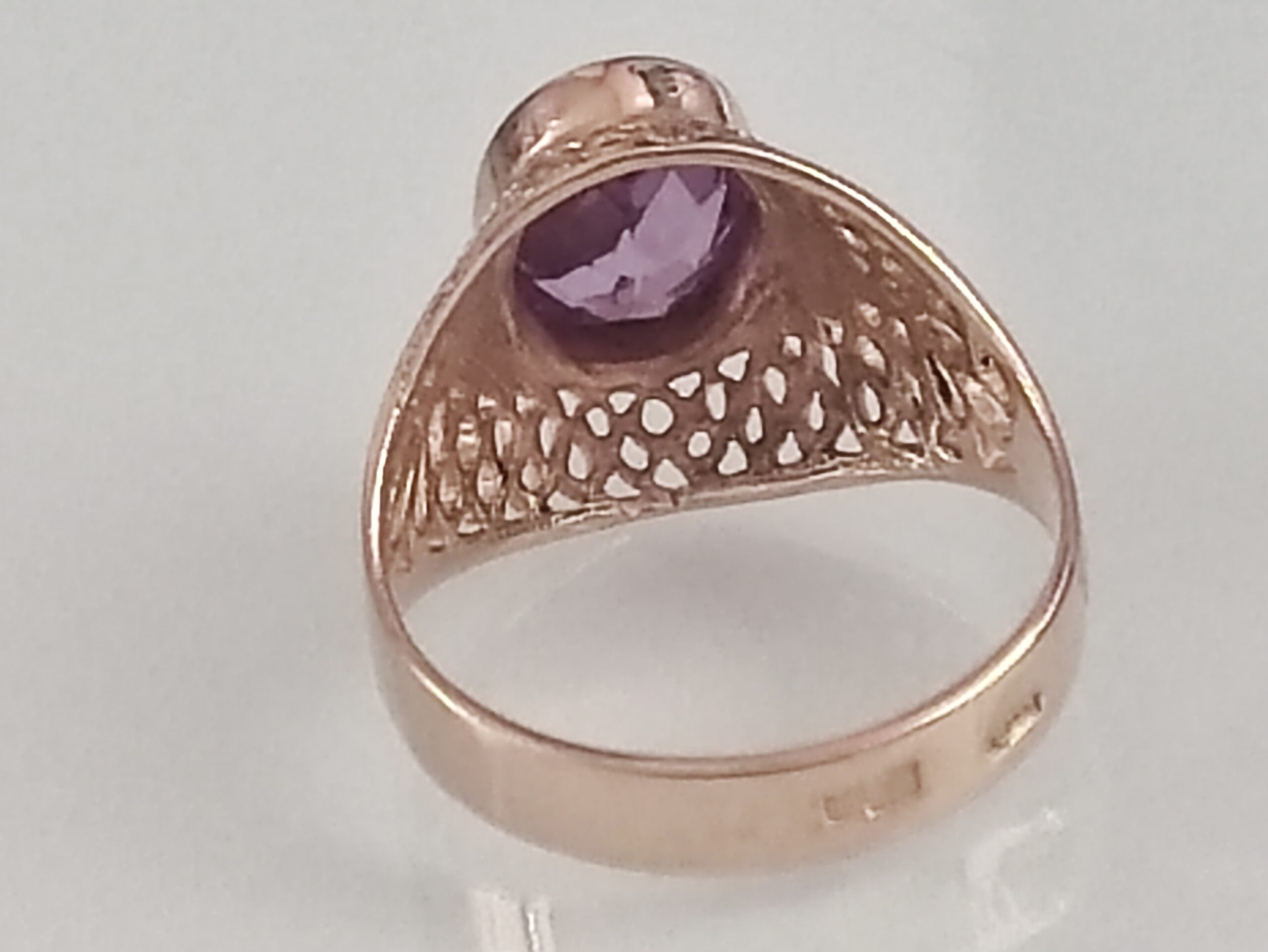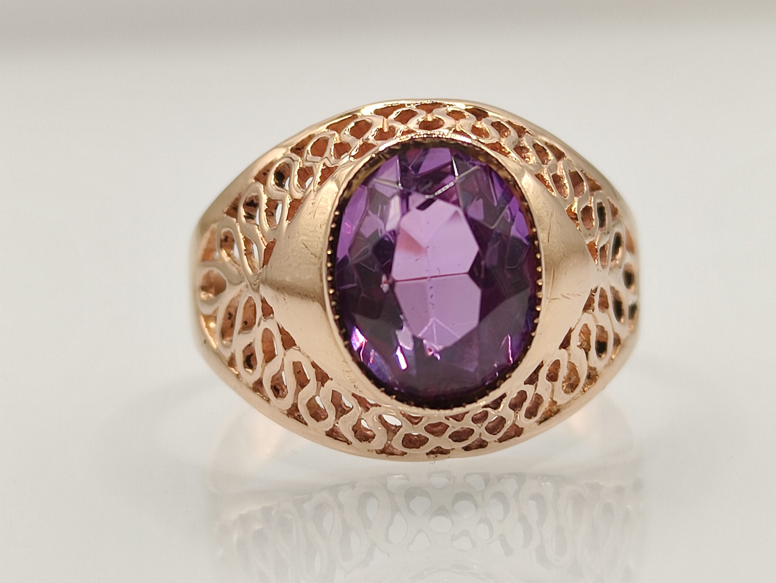 Ein traumhaft schöner, sehr großer Ring aus der ehemaligen UdSSR in 583er Rotgold mit einem facettierten Farbwechsel – Alexandrit in Violett. Der Stein funkelt je nach Lichteinfall zwischen diversen Violett- und Rottönen.
